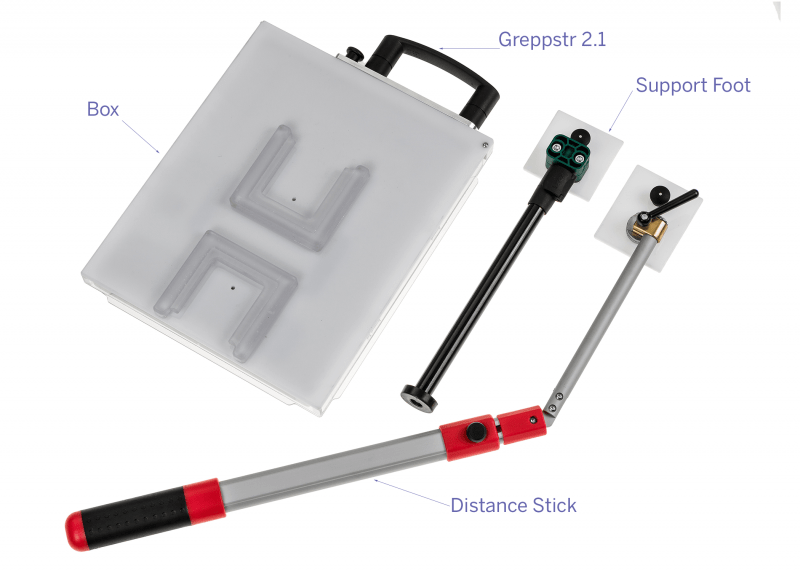 - The Polycarbonate box comes standard with a Distance Stick, Support Foot, and the Greppstr 2.1 universal handgrip (for wireless Flat panels) for easy carrying around.